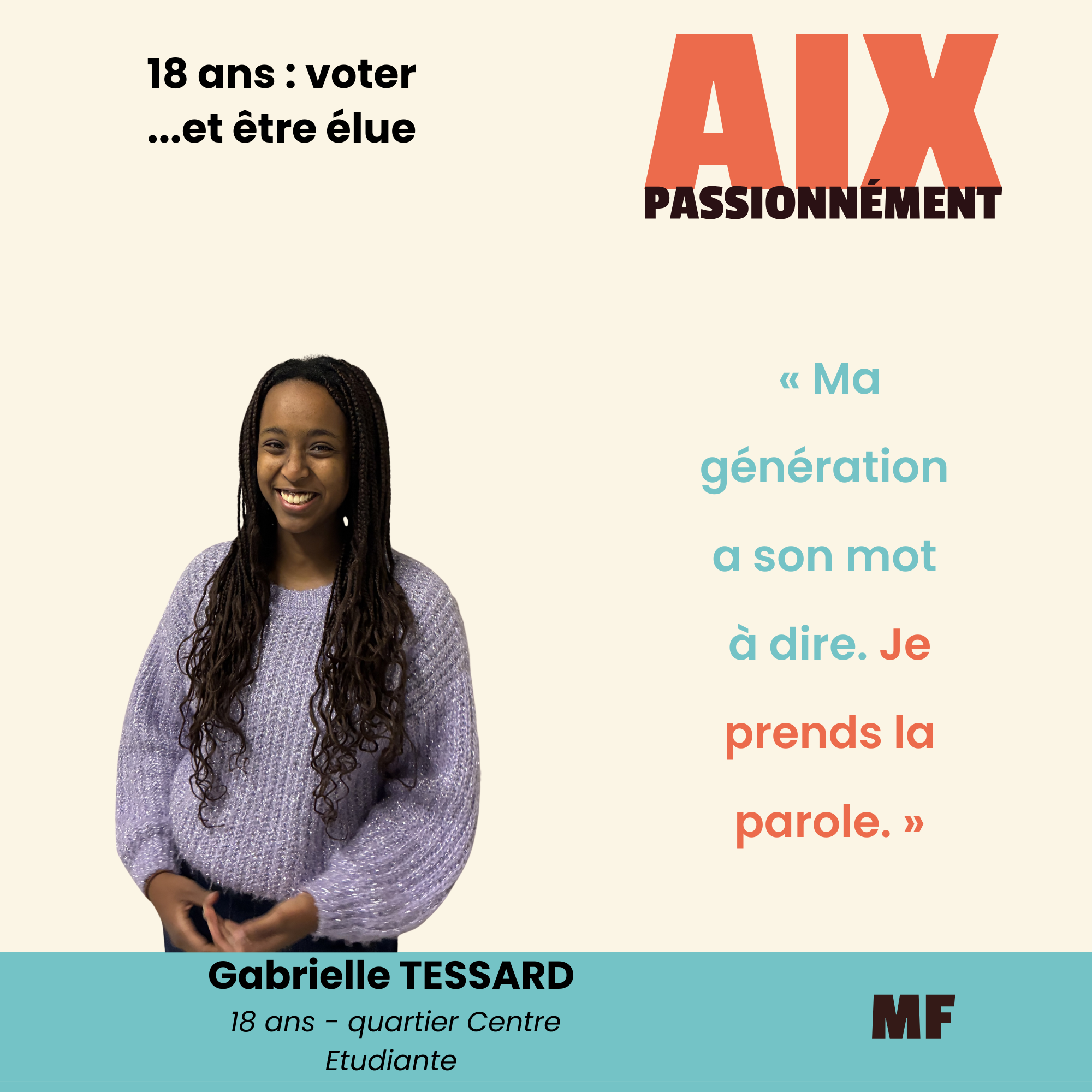 Gabrielle est la benjamine de la liste. À 18 ans, elle fait le choix de s'engager dans la vie citoyenne plutôt que de rester spectatrice.