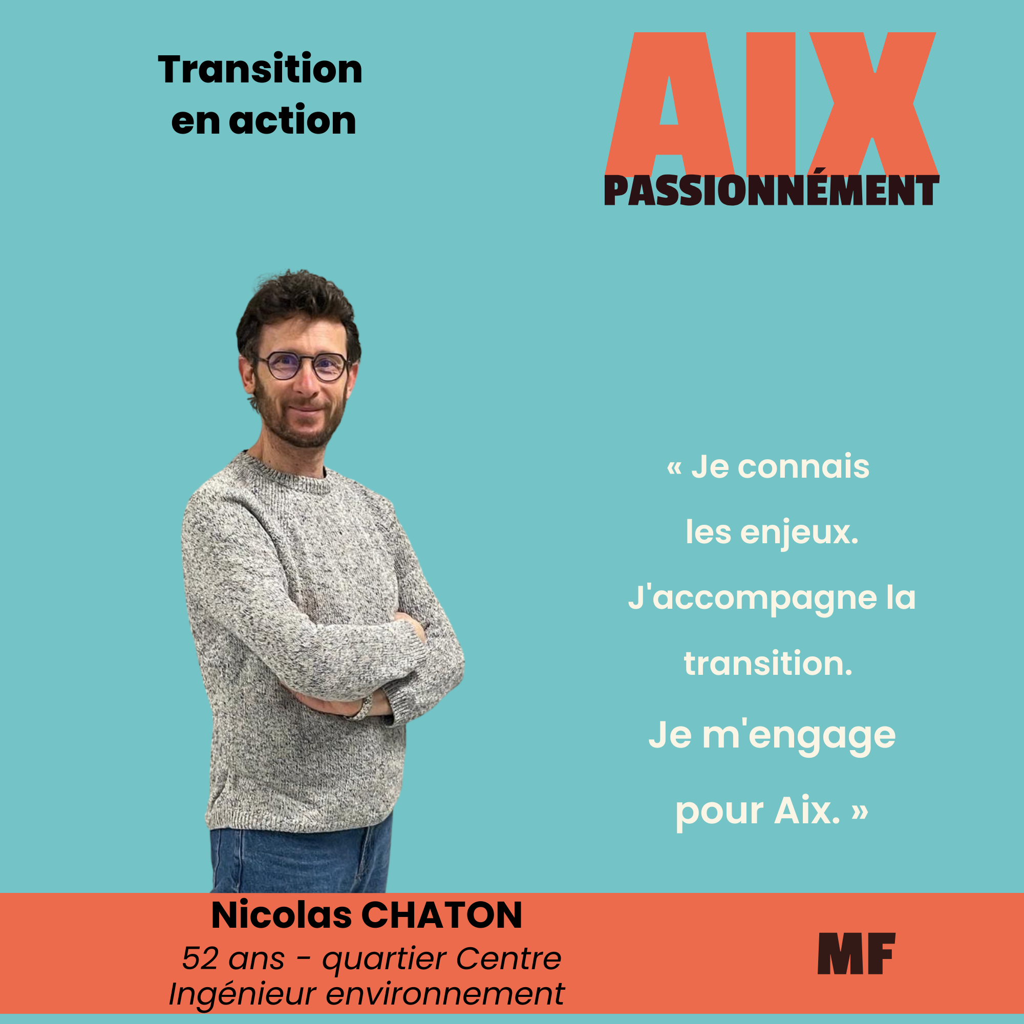 Aixois depuis 23 ans, Nicolas accompagne chaque jour entreprises et collectivités dans leurs transitions écologique et énergétique. C'est son métier. Bientôt, il veut le faire pour sa ville.